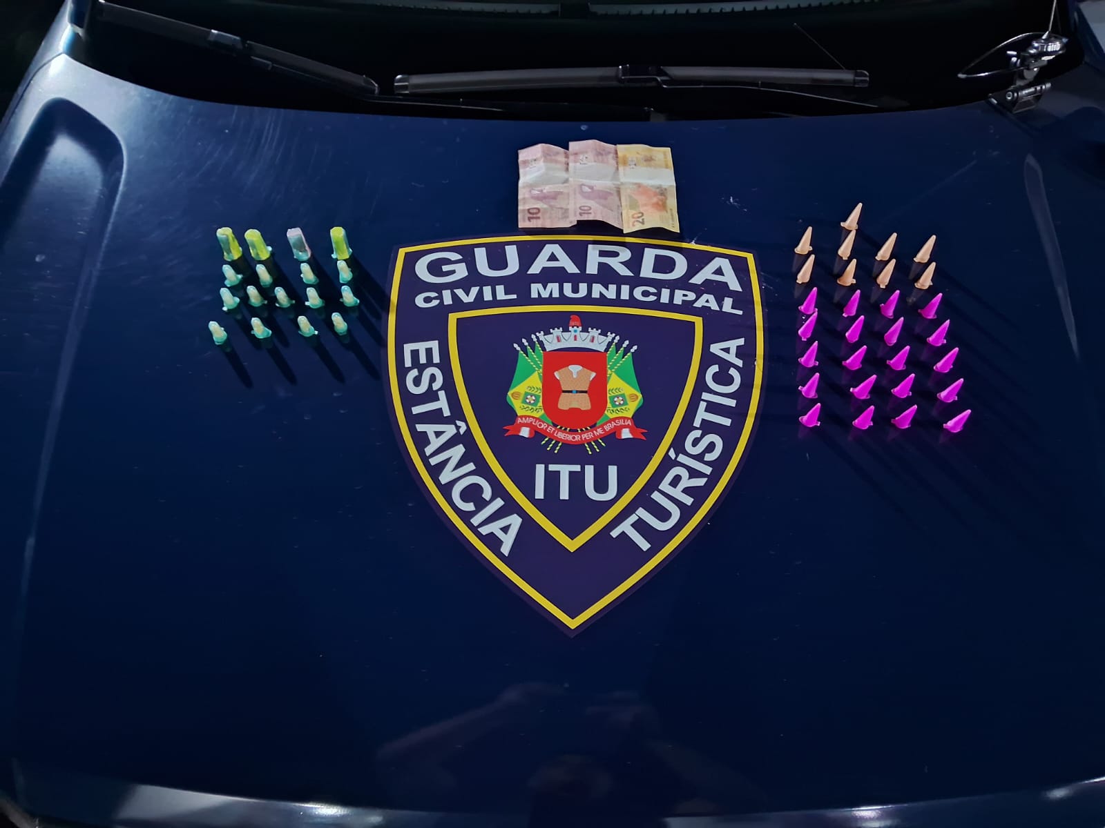 Após a denúncia, os guardas abordaram o suspeito em frente a uma adega e encontraram com ele 29 porções de cocaína, 13 de crack e quatro de skunk, além de R$ 40,00 em dinheiro.
