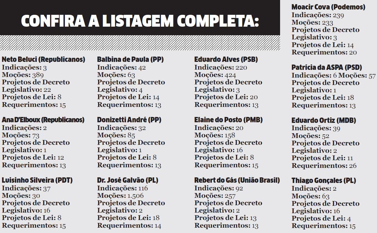 Moções: Na apresentação de moções, o destaque absoluto é Dr. José Galvão, com expressivas 1.506 moções. Na sequência, aparecem Engenheiro Eduardo Alves com 424, e Neto Beluci (Republicanos), que contabiliza 389 moções apresentadas.