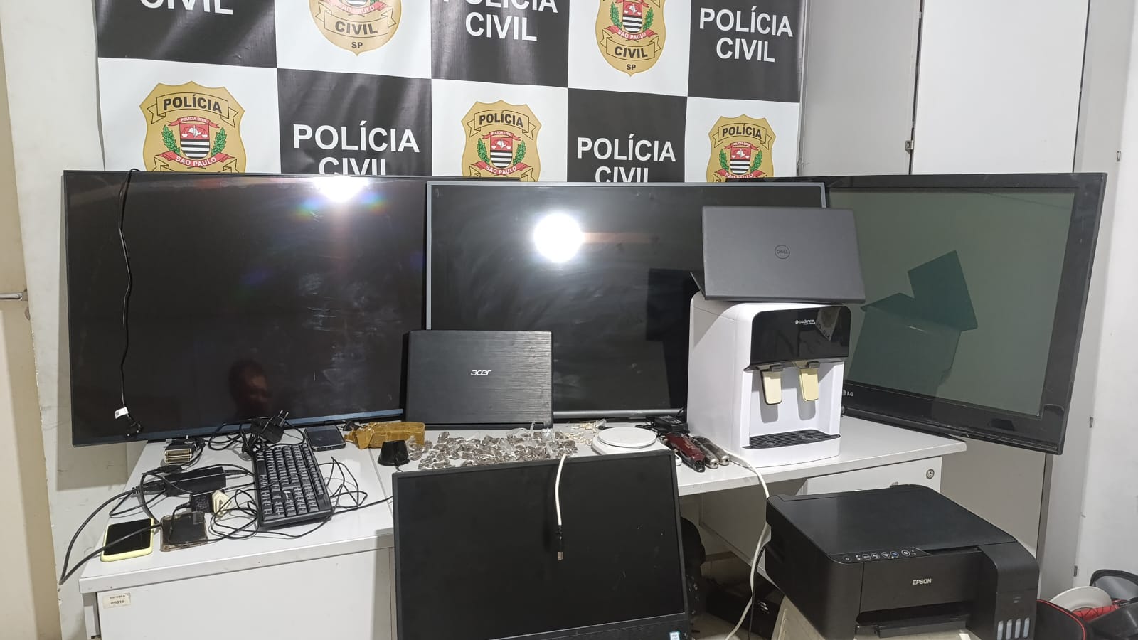 Na comunidade, além dos produtos furtados (uma balança de precisão, uma impressora, um bebedouro, um barbeador, dois notebooks e três televisores), foi encontrada uma Honda/CG branca que havia sido roubada na cidade e diversas porções de drogas, compreendidas entre 120 de maconha e 38 de crack.