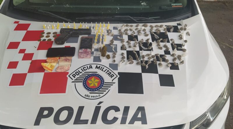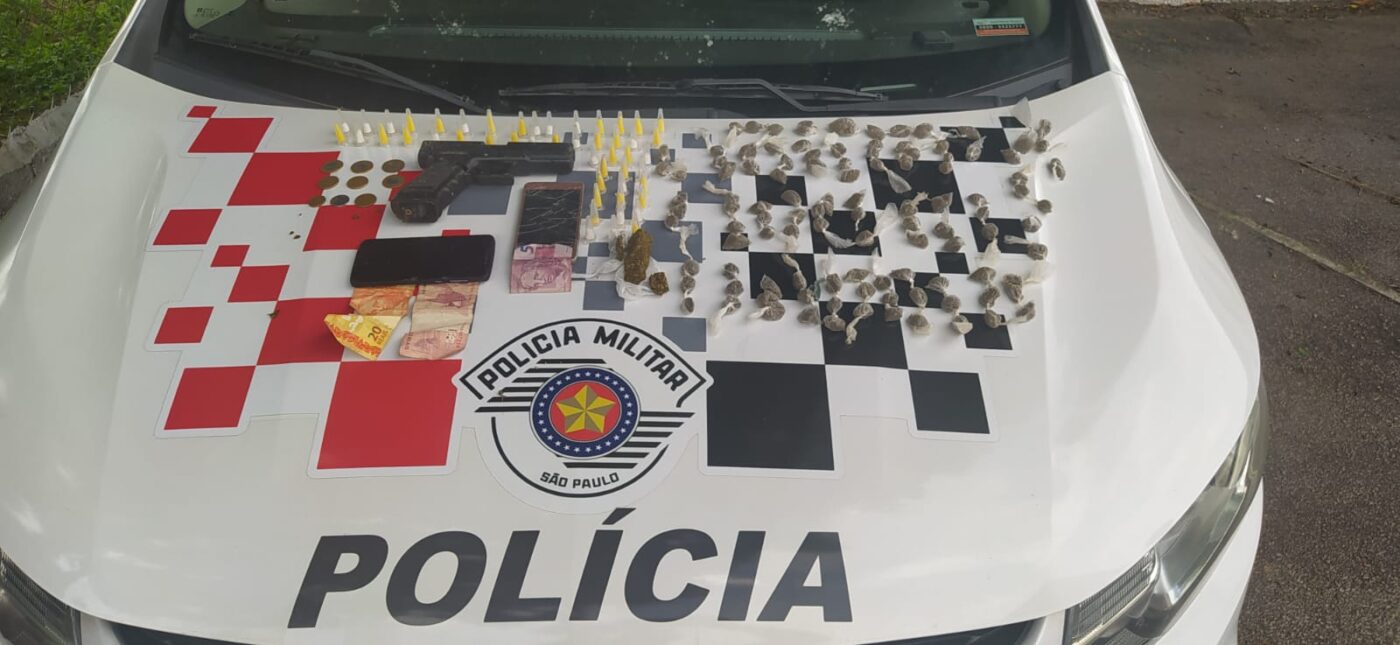 As autoridades então seguiram os rapazes, promovendo a abordagem e encontrando em poder dos averiguados uma réplica de arma de fogo, 49 microtubos contendo cocaína, 108 porções de maconha e R$ 39,95 em dinheiro.