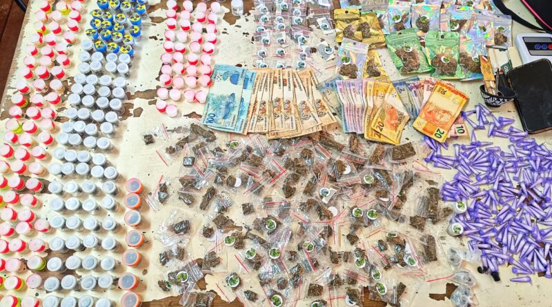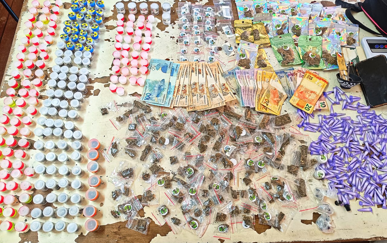 Os policiais fizeram o acompanhamento e conseguiram abordar dois dos indivíduos (o adulto e o adolescente). Na posse da dupla, foi encontrada uma bolsa preta que tinha em seu interior 687 gramas de maconha, 300g de cocaína e 236g de crack. Ainda durante a ocorrência, foram apreendidos pelas autoridades um telefone celular e a quantia de R$ 1.377,40 em dinheiro.